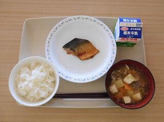 今日の給食は、ごはん、牛乳、サバのスタミナ焼き、豚汁です。