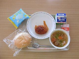 今日の給食は、コロッケサンド、牛乳、ミルメーク、肉団子スープです。