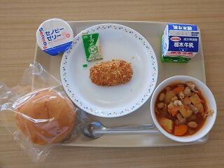 今日の給食は、えびカツサンド、牛乳、ポークビーンズ、セノビーゼリーです。