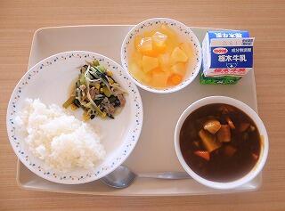 今日の給食は、ごはん、牛乳、ポークカレー、小松菜のソテー、レモンのジュレポンチです。