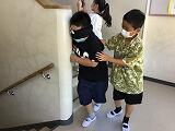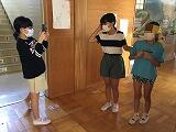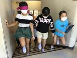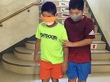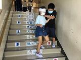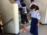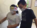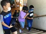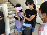 総合の学習では、福祉について勉強をしています。今回は目の不自由な人の立場になり、目をタオルで隠して階段の上り下りを行いました。体験者、補助をする人、記録者(撮影する人)と分けて、ローテーションでそれぞれの役目を行いました。