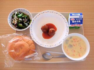 今日の給食は、ハチミツパン、牛乳、野菜入りミートボール、海藻サラダ、えびとあさりのクリームスープです。