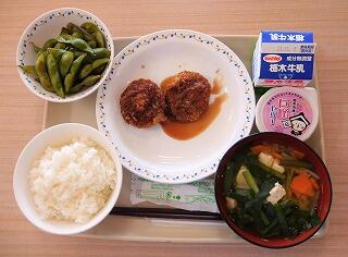 メニューは、ごはん、牛乳、栃木市産豚肉のソースカツ、黒大豆枝豆、にらのみそ汁、とちすけ巨峰ゼリーです。