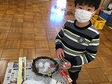 子どもたちは、一人一個、サツマイモの蔓で作ったリースに、飾り付けを楽しみました。担任が作った蔓のリースを見せると、誰かにプレゼントしようということになりました。5人の先生方に、プレゼントすることになりました。