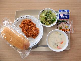今日の給食は、ミルクパン、牛乳、ササミチーズフライ・ソース、もやしと小松菜のソテー、ミネストローネ