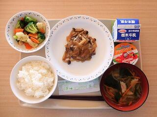 今日の給食は千塚小6年生のリクエスト献立です。テーマは、「和風食材ソテー」で、全体的に和風に統一されています。いろいろな食材を上手に組み合わせ、いろどりもカラフルできれいに仕上がっています。栄養バランスはもちろん、目でも楽しめる給食ですね。