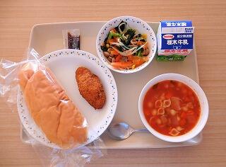 今日の給食は、ミルクパン、牛乳、ササミチーズフライ・ソース、もやしと小松菜のソテー、ミネストローネ