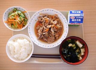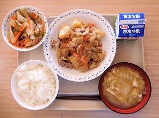今日の給食は、ごはん、牛乳、肉じゃが、大根と茎わかめのサラダ、白菜と油揚げのみそ汁です。