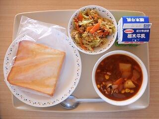 今日の給食は、メープルミルクトースト、牛乳、メキシカンシチュー、ツナと野菜のソテーです。