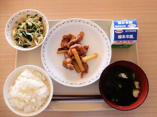 今日の給食は、ごはん、牛乳、鶏肉のからあげ、しもつかれ、豚汁、ヨーグルトです。