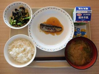 今日の給食は、ごはん、牛乳、いわしの生姜煮、磯香和え、いなか汁、福豆です。