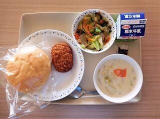 今日の給食は、セルフコロッケサンド、牛乳、ヘルシーサラダ、白菜のクリームスープです。