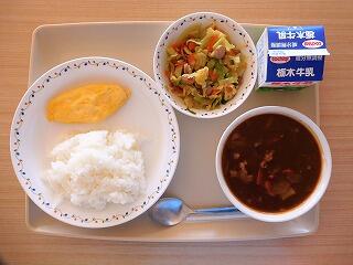 今日の給食は、ごはん、ハヤシライス、牛乳、チーズオムレツ、キャベツのソテーです。