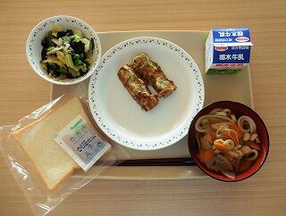 今日の給食は、食パン、とちおとめジャム、牛乳、煮込みうどん、竹輪の磯辺揚げ、おひたしです。