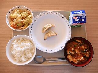 今日の給食は、ごはん、牛乳、マーボー豆腐、焼きぎょうざ、もやしの中華和えです。