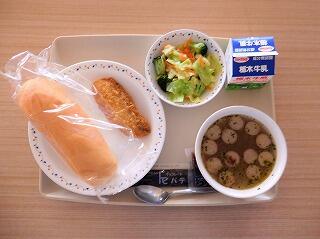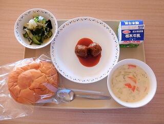 今日の給食は、ハチミツパン、牛乳、野菜入り肉団子、海藻サラダ、クラムチャウダーです。