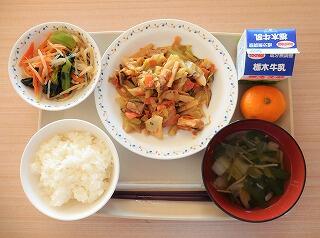 今日の給食は、ごはん、牛乳、厚揚げと野菜の炒め物、もやしのナムル、ニラのピリ辛スープ、みかんです。