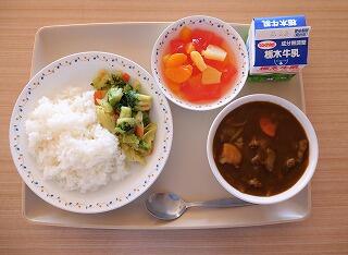 今日の給食は、栃木市産の牛肉を使ったビーフカレーです。牛肉について詳しくはちょこっと食通信を見てください。デザートは、とちおとめのゼリーを使ったフルーツポンチが出ています。辛いものを食べた後は、冷たく甘いデザートがさっぱりとおいしく感じますね。
