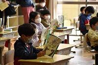 「聞く読書」では、給食の時間に教職員が本の朗読を行います