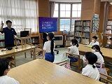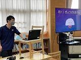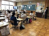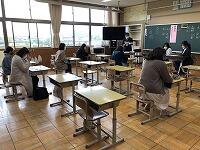 千塚小では、「ランチルーム」という広い部屋があるので、そこに先生方が席を離れて着席し、大型スクリーンに映し出される講師の先生の話を視聴することができました。