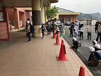 騒がしいと小さな音が聞こえないので、間隔をあけて、静かに待っています。検査の前には、手指消毒もしっかりします