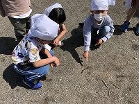 1年生はお掃除の時間、校庭の石拾いを2年生のお兄さん・お姉さんと一緒に任されています