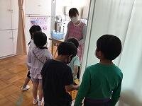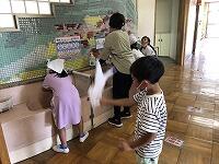 子どもたちはマスクをして、耳に髪がかからないように赤白帽をかぶっています。保健室前の廊下に間隔をあけて並んで静かに待ち、入室前に手指消毒をします了解