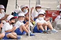 ↓↓ 1年生から4年生は、児童席のテントに並んでいます。少し席が近いので、児童席ではマスクを付けています。