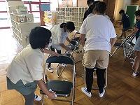 まず、みんなで体育館やスタジオから、昇降口付近に長机や椅子を運び、椅子の座面や背もたれをきれいに拭く作業をしました。明日の朝、校庭に運び出して設置しますピース