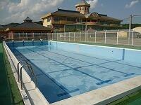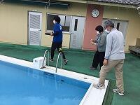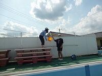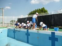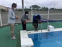 おかげさまで、雷雨は少し遠ざかってくれたようで、清掃も完了し、きれいで清潔な水泳環境が整いました。作業で使った清掃用具の水が切れたので、片付けまで終了!来週から、いよいよ水泳学習が始められますね笑う
