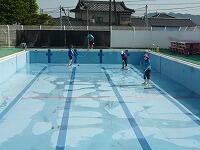 5・6時間目に、5・6年生と教職員が、プール清掃を行いました。天気予報では、午後から雷雨雷とのことだったので、「雨雲レーダー」をこまめに確認しながら作業を進めました。