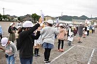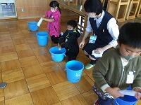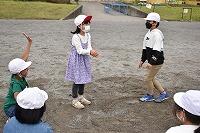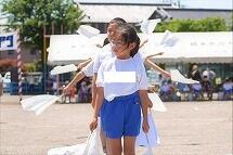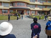 ↓↓ 放送の合図で、子どもたちがカラーエプロンを着て、校庭に出てきました。