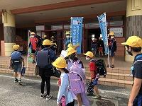 ↑↑ 昇降口前で一緒に歩いてくださる保護者ボランティアの皆様にあいさつをして、いよいよ出発です!