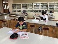 「えのき学童」の子どもたちの人数が多いので、午前中は5・6年生の希望者が校舎内の家庭科室を利用しています。感染症の急拡大への対応として、部屋を分散させるための対策です注意