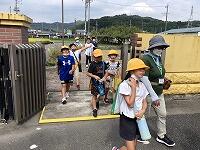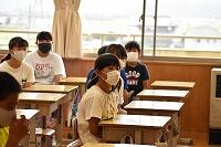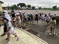 ランドセルのふたを利用して頭と首、背中を守る方法を体験しました千塚小の校舎は、他の学校より窓が多いので、窓ガラスのない空間が少なく、担当の先生を中心に、担任の先生方と相談して、安全な場所を設定して指導し、避難場所に避難する体験をしました