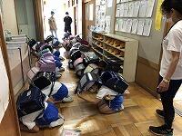 子どもたちが下校する頃、雨がたくさん降っていたので、昇降口前に並ぶことができません。そこで、交通指導担当の先生が中心となって、昇降口での「方面別呼び出し下校」を行いました放課後教室に参加する子、「3J」や「えのき」の学童保育へ行く子から、並んで一人一人確認・チェックをしてから下校するようにしました