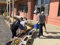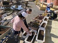 清掃の時間に、校庭掃除の人たちが、プランターの土づくりをしてくれました了解技能員の先生に教えてもらいながら、肥料をたっぷりまぜた土をプランターに入れていましたにっこり