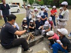 1ツ星まきに火を付けます。この火起こしが難しくて、みんなの力を合わせることが必要ですひらめき