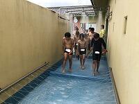 昼休みには、校長先生・教頭先生・教務主任の先生・体育主任の先生で、プールサイドで「安全で楽しい水泳学習ができますように…」とお願いをしました。そして、大プールと小プールの四隅で、“お清め”の儀式を行いましたひらめき