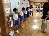 それでも、日中はかなり気温が上がってきました。休み時間やプールでの学習の前には、必ず暑さ指数(WBGT)をチェックしています。給食が終わる頃も確認をして、養護教諭の先生が、校内放送で注意を呼び掛けてくださいましたお知らせ
