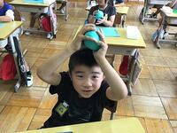 竜巻対応避難訓練では、突風によって様々なものが飛来してくることを想定し、ランドセルを使って「だんごむしのポーズ」をとる訓練をしました。先生の指示に耳を傾け、すばやく避難の態勢をとることができました。