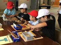生の小麦や大豆を触ってみたり、もろみを少し舐めてみたりと発見がたくさんあった授業になりました。子どもたちも、博士と一緒に楽しんでいましたピース
