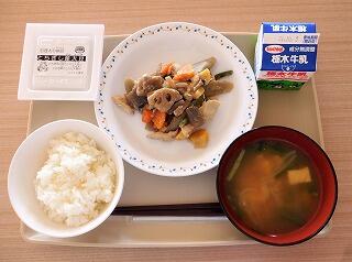 今日の給食は、ごはん、牛乳、秋野菜の煮物、栃木市産麦納豆、もやしと生揚げのみそ汁です。