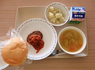 今日の給食は、丸パンスライス、ハンバーグトマトソース、牛乳、粉ふきいも、野菜スープです。