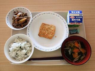 今日の給食は、わかめごはん、牛乳、じゃこカツ、五目きんぴら、もやしとしめじの味噌汁です。