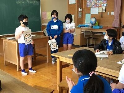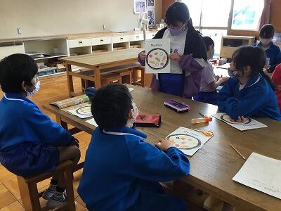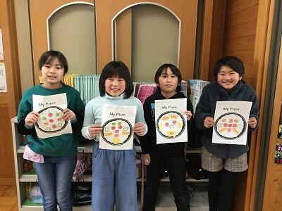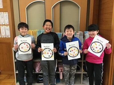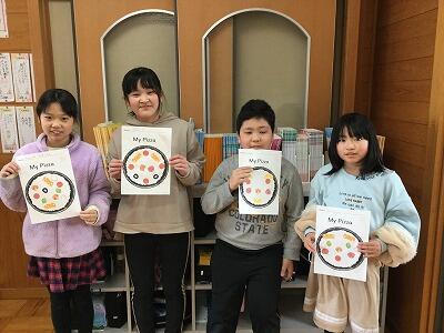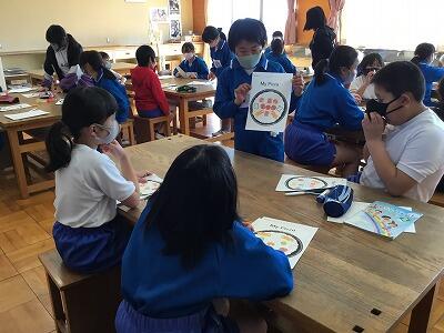 外国語活動の時間に、ピザ生地の絵を描いた紙を使ってオリジナルのピザ作りをしました。