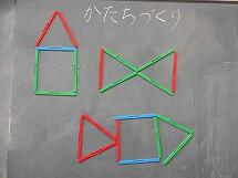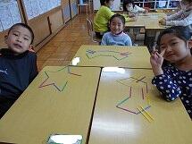 算数の時間に、数え棒を使って三角や四角の形を作った後に、好きな形を作ってみました。