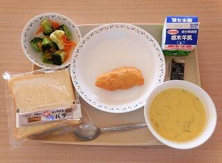 今日の給食は、食パン・キャラメルクリーム、牛乳、ササミチーズフライ、ソース、ブロッコリーサラダ、コーンポタージュです。
