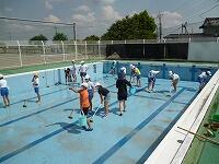 おかげさまで、雷雨は少し遠ざかってくれたようで、清掃も完了し、きれいで清潔な水泳環境が整いました。作業で使った清掃用具の水が切れたので、片付けまで終了来週から、いよいよ水泳学習が始められますね