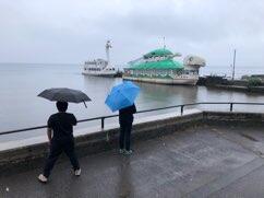 猪苗代湖長浜に来ました。喜多方の街も、幸い傘をささずに歩けましたが…さすがに降りが強くなってきて、「この折りたたみ傘、初めて使いました」という子もいます雨